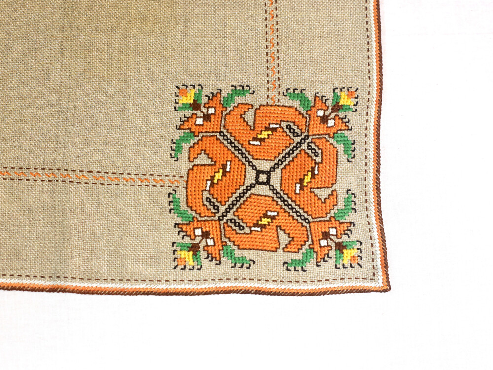 Ръчно бродиран тишлайфер с памучно мулине върху ленена панама.